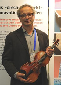 Swiss violin maker Michael Rhonheimer with one of his “biotech” violins. ~ photo, EMPA