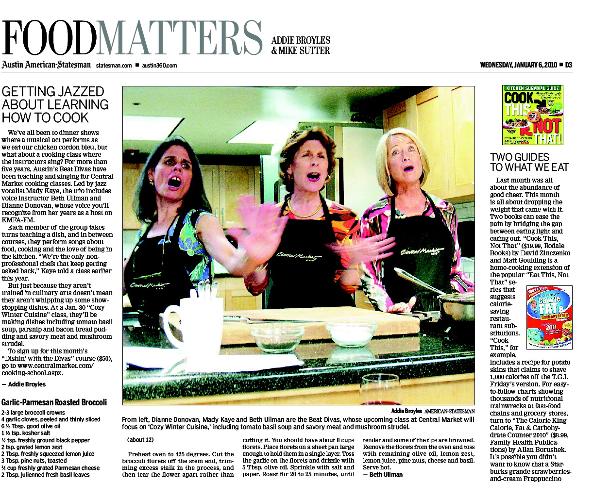 As diverse as classical music is, our KMFA announcers and hosts are also known for their expertise in other musical genres. Our mid-day host, Dianne Donovan, is also a famous for her jazz singing! She is one-third of a group called The Beat Divas, and in addition to preforming at local jazz venues, they also teach a cooking class at Central Market. This class, “Dishin’ up the Divas,” was recently featured in the Austin American Statesman. Click on the thumbnail image below to read the whole article, complete with recipe!