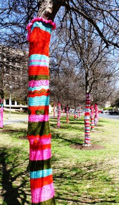 It was all part of the “Knitted Wonderland” that is officially referred to as a “site-specific installation,” designed by textile artist Magda Sayeg, and crafted by over 170 local volunteer knitters. I confess that when I saw it, I’m old enough to be reminded of toe socks. 😉 The bright knits added vivid color to the yet-leafless trees.